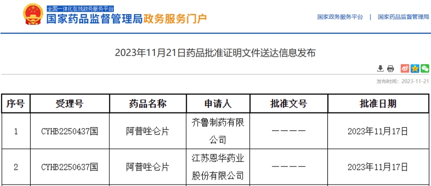 近日,据NMPA官网公示,齐鲁制药和江苏恩华药业提交的阿普唑仑片化药同日通过一致性评价。据药融云数据统计,阿普唑仑在2022年全国院内销售(化学和生物药)抗焦虑药市场,为TOP5品种,市场份额近10% 。此外,该品种目前多家企业布局,超50家企业获批。