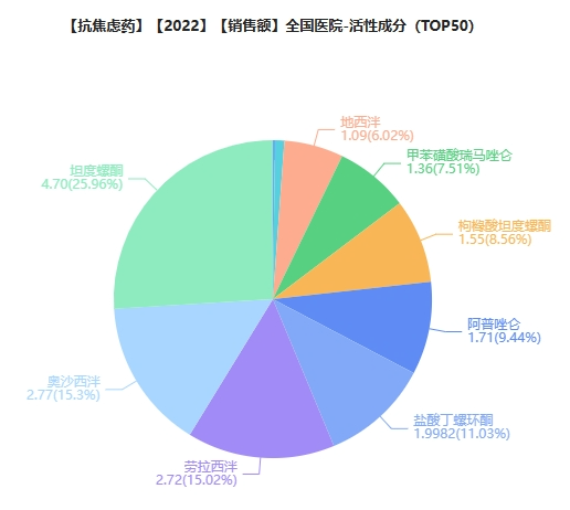 据药融云数据统计,在全国院内销售(化学和生物药)抗焦虑药市场格局主要由8种药物占据,包括坦度螺酮、奥沙西泮、丁螺环酮、劳拉西泮、阿普唑仑、地西泮、瑞马唑仑、复方地西泮。其中阿普唑仑在2022年全国院内销售超1亿元,同比增长达19.18%。