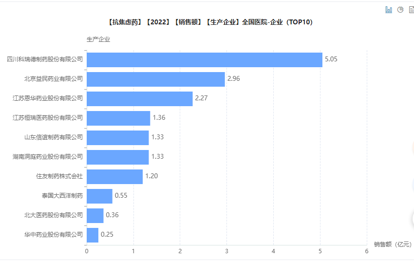 从企业来看,四川科瑞德制药在抗焦虑药市场中位列第一,而北京益民药业和江苏恩华药业紧随其后,跻身第二和第三名。此外,江苏恒瑞医药、山东信谊制药、湖南洞庭制药、佳友制药等7家企业也成功进入市场前十名。