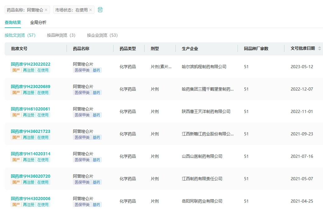 据药融云数据统计,目前阿普唑仑共有53家国内企业获批生产。其中,大部分企业的阿普唑仑都为片剂,而黑龙江瑞格制药的阿普唑仑为胶囊剂。