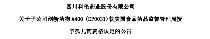 11 月 27 日,科伦药业发布公告,称其子公司科伦博泰在研产品 A400(在转染过程中重排(RET)小分子激酶抑制剂项目,亦称为 KL590586 或 EP0031),于近日获得了美国 FDA 授予的孤儿药资格认定,用于治疗 RET 融合阳性实体瘤。