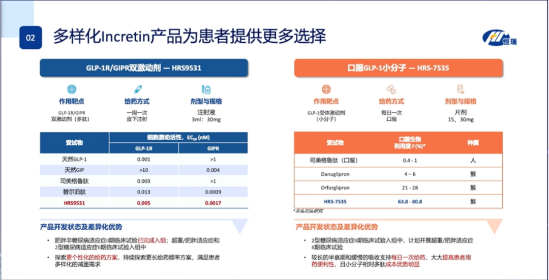 会上针对降糖/减重领域,恒瑞GLP-1R/GIPR双激动剂HRS9531、口服GLP-1小分子HRS-7535迎来了重点介绍,体现了恒瑞医药对于这个千亿市场的重视。