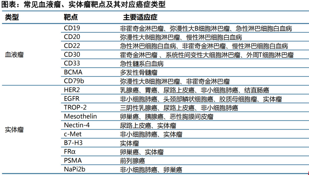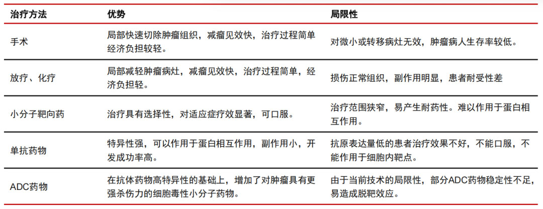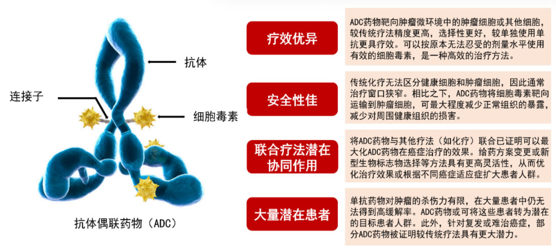 抗体偶联药物(Antibody-drug conjugates, ADC)由靶向肿瘤特异性抗原或肿瘤相关抗原的单克隆抗体(Antibody)与不同数目的小分子毒素(Payload)通过连接子(Linker)偶联组成。其兼具单抗药物的高靶向性以及细胞毒素在肿瘤组织中高活性的双重优点,可高效杀伤肿瘤细胞,较化疗药物副作用更低,较传统抗体类肿瘤药物具有更好的疗效。且具备与其他疗法联合的协同作用并可用于治疗单抗药物疗效不佳的大量潜在患者。