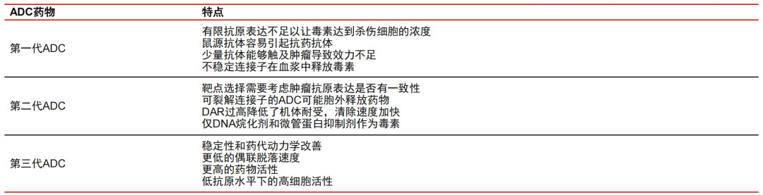 第一代ADC药物以靶向CD33的Mylotarg为代表性药物,使用鼠源抗体,免疫原性较强,易产生人抗鼠抗体;连接子不稳定,毒素在血浆中提前释放导致严重的毒性反应;细胞毒素药物效力不足,不足以杀死肿瘤细胞。