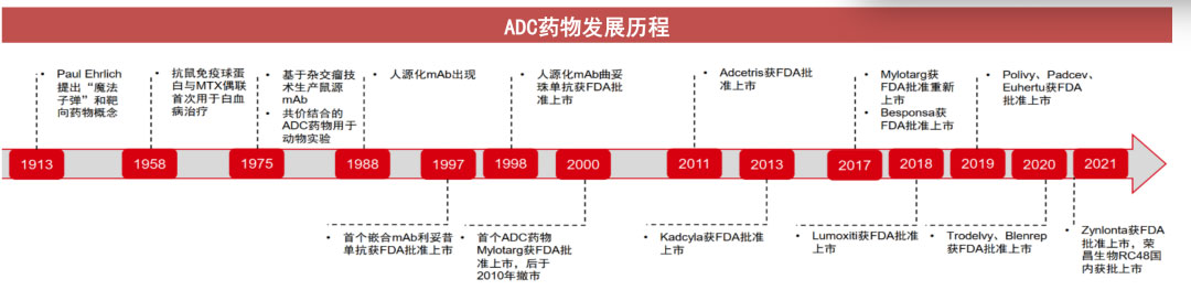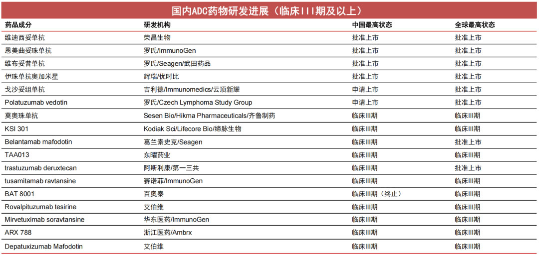 相比美国,国内ADC药物起步较晚,首款ADC上市时间间隔21年。进展最快的荣昌生物维迪西妥单抗于2021年6月获批上市,成为国内首款上市的国产ADC药物。