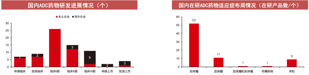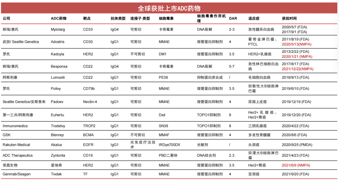 截至目前,全球已有14款ADC药物获批上市,7款用于血液肿瘤,7款用于治疗实体瘤,靶点涉及CD33、CD30、CD22、CD79b、HER2、Nectin-4、Trop-2、BCMA、EGFR、CD19和TF。其中,4款ADC药物在中国上市。荣昌生物自主研发的维迪西妥单抗于2021年6月9日在国内获批上市,成为首个获批的国产ADC新药。此外,Adcetris和Kadcyla于2020年获NMPA批准在中国上市, Besponsa于2021年12月在中国获批上市。