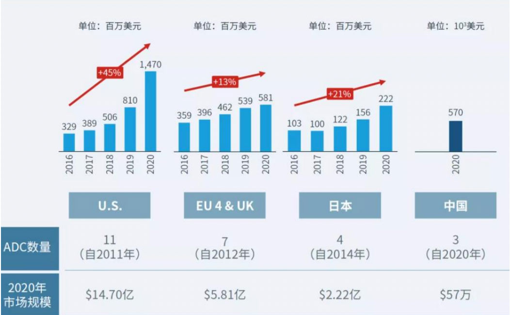 美国:首款ADC药物在美国上市,目前在上市药物数量及市场规模均遥遥领先于其他地区。自2011年以来共有11款ADC药物获批上市,2016-2020年,美国ADC药物市场规模从3.29亿美元增长至14.70亿美元,CAGR高达45%,是全球增速最快的地区。