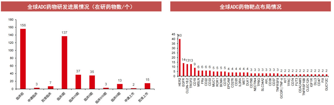 全球共有408款ADC药物在研,研究靶点集中在经验证的成熟靶点,热门靶点药物竞争日趋激烈。