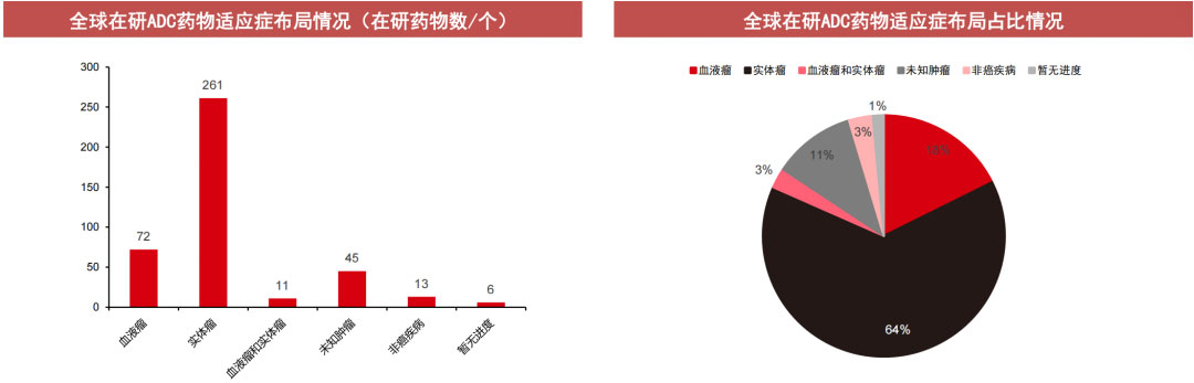 从全球在研ADC药物适应症布局情况看,肿瘤占绝大多数。与已上市的药物的适应症布局情况不同,在研ADC药物更多往实体瘤延伸,主要集中在乳腺癌、肺癌、胃癌等患病人群较多的癌种,血液瘤占比18%。其他适应症包括类风湿性关节炎、AL淀粉样变性、金黄色葡萄球菌血症、移植物抗宿主病以及年龄相关黄斑变性等眼病。