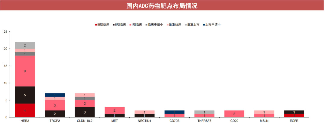 国内已知靶点的69个ADC药物,较为热门的靶点包括HER2、TROP2、CLDN-18.2、MET、NECTIN4、CD79B、TNFRSF8、CD20、MSLN和EGFR。相比全球热门靶点,CD22、BCMA等靶向血液瘤的靶点布局明显减少。其中在研药物数量最多的是HER2,共有22个,TROP2排名第二,共有7个。国内约三分之一的ADC药物靶向HER2,目前除2款已获批上市,4款处于临床III期外,尚有9款处于临床I期。