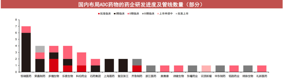 处于临床III期的东曜药业(自主研发)、齐鲁制药(与Sesen Bio合作)、浙江医药(自主研发)、华东医药(与ImmunoGen合作)、缔脉生物(与Kodiak Sciences合作)。恒瑞医药布局的ADC药物尽管仍处于研发早期,管线数量国内最丰富(1款II期、6款I期,靶点涉及HER2、c-MET等)。
