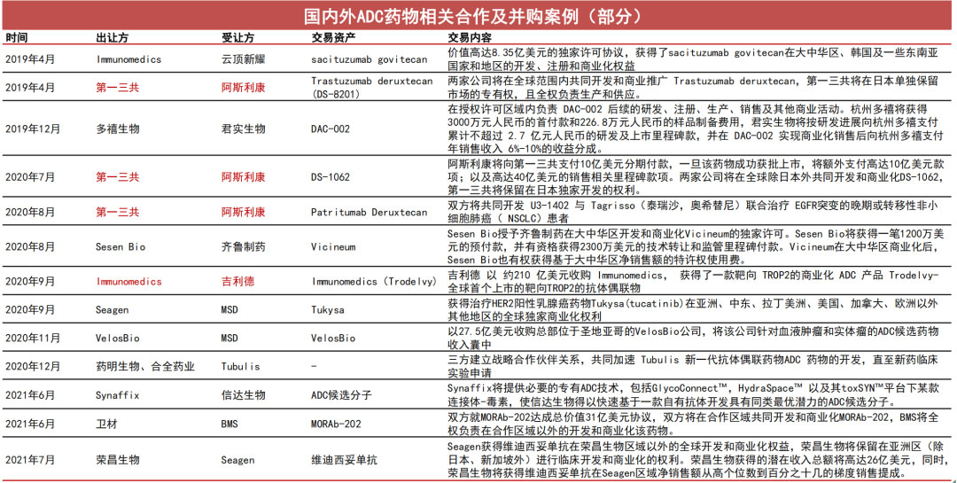 2021年3月,辉瑞将两款ADC候选药物PYX-201和PYX-203的全球商业化权益许可给Pyxis Oncology(辉瑞和拜耳是股东),其中PYX-201是辉瑞开发的一款非内吞性ADC;此外,辉瑞还将为Pyxis提供其ADC技术平台的许可,包括各种有效载荷类别、Linker技术和偶联技术,用于开发其他ADC药物