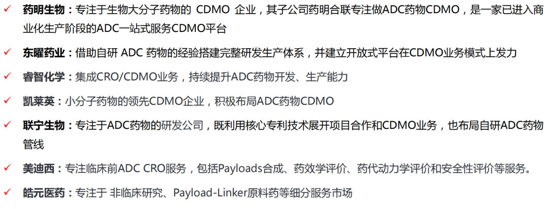 国内ADC研发管线中新兴Biotech公司占比大。研发、生产技术的高壁垒促使大多数药企寻找合同研发生产组织(CDMO)机构赋能创新。据了解,全球大多数ADC药物以外包为开发形式,借助CDMO企业更快进入临床阶段以及市场。海外公司为了控制研发成本也选择价格低廉的国内CDMO企业进行合作。伴随国内外ADC领域进入快速发展阶段,尤其是同类型靶点的竞争加剧,高效的临床推进和差异化的适应症开发策略成为ADC药物布局药企未来取得市场竞争优势的重心,因此选择合适的CDMO伙伴合作也是这些药企研发生产的重要策略。