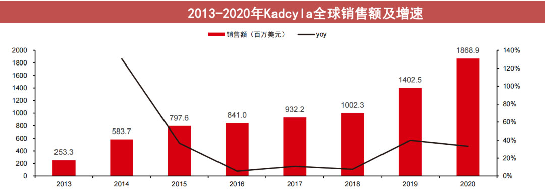 得益于优异的临床疗效,Kadcyla成为目前全球商业化最成功的ADC药物。2020年全球销售额达18.69亿美元,同比增长33%,在2020年度全球最畅销肿瘤药物中位列第十一。