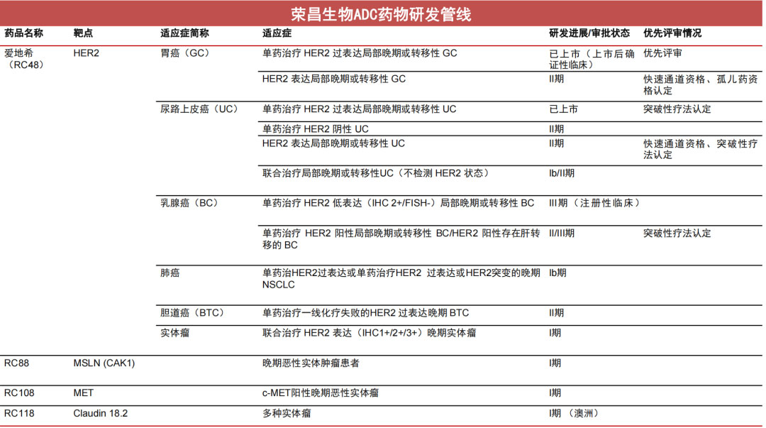 (1)爱地希(维迪西妥单抗,RC48)是中国首款自主研发的ADC药物,也是目前唯一一款获得FDA突破性疗法认定的国产ADC产品。
