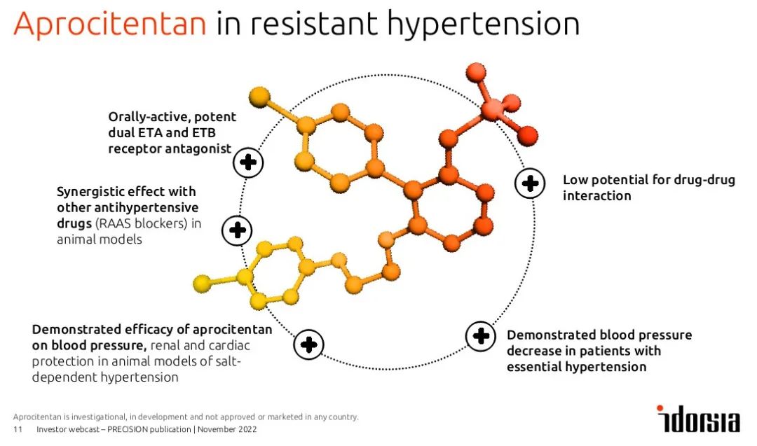 Aprocitentan是一款靶向双重内皮素(endothelin)受体的口服拮抗剂。内皮素信息通路控制血管的收缩,被发现与高血压病变相关,在顽固性高血压患者中,此通路经常被激活,然而目前并没有抑制此通路的疗法。Aprocitentan除具潜力抑制内皮素通路外,其与其他药物产生药物间相互作用的机率低,这些特征都让aprocitentan具潜力成为治疗顽固性高血压患者的药物。
