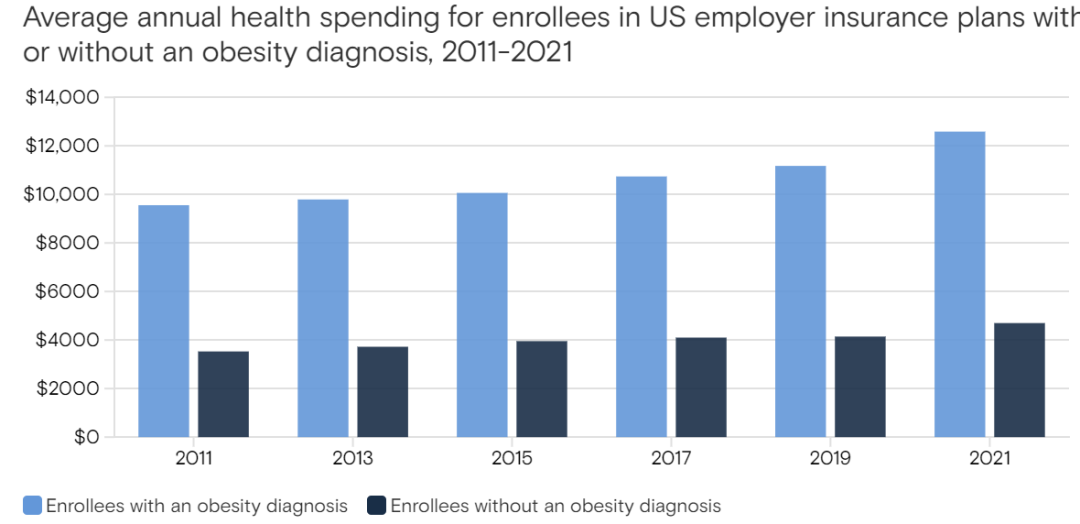 图1. 2011-2021年在美国雇主提供的医疗保险计划中,患有肥胖症和没有肥胖症群体的平均年度健康支出对比图。(图片来源:高盛)