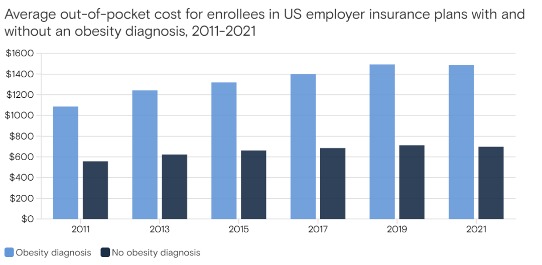 图2. 2011-2021年在美国雇主提供的医疗保险计划中,参保人被诊断有肥胖症和没有肥胖症的群体平均自付费用对比图。(图片来源:高盛)