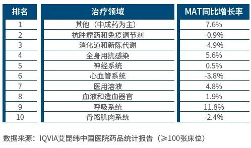 纵观各大治疗领域,呼吸系统品类季度增速继续保持所有品类第一,为8.3%,其MAT年销售额增长11.8%。中成药季度增速位列第二,但在医院市场的占比仍位列第一,季度销售额同比增长4.1%,其MAT年销售额同比增长7.6%。抗肿瘤药和免疫调节剂增速位列第三,季度销售额同比增长1.8%,MAT年销售额同比下降0.9%。(图1)