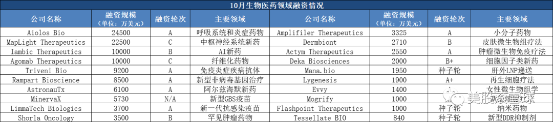 CNS与自体免疫仍是热门赛道。10月,有MapLight、AstronauTx两家中枢神经系统(CNS)药企获得融资,亦有Aiolos Bio、Agomab 、Triveni、Dermbiont等多家自体免疫系统药物公司获得融资,而肿瘤药物领域却略显落寞;