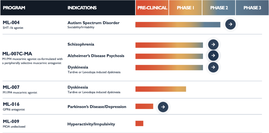 ML-007:一款毒蕈碱受体激动剂,旨在靶向M1和M4毒蕈碱受体亚型,但对多巴胺受体没有直接活性。M1受体缺陷与精神分裂症有关,直接调节对精神病和认知都很重要的神经回路,M4受体调节在精神病中很重要的互补神经回路,目前正在研究治疗运动障碍;