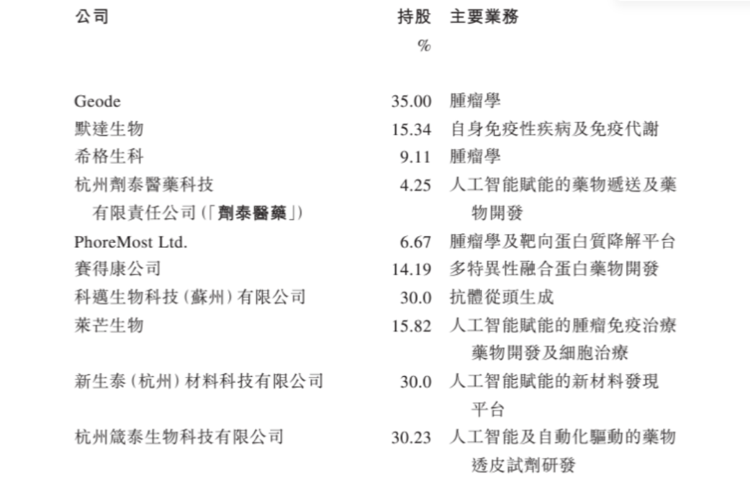技术赋能客户之外,目前,晶泰科技还围绕上下游关键产业链和技术,孵化和投资了数家创新型公司,包括Geode、希格生科、剂泰医药、新生泰等,研发领域覆盖多个疾病领域,以及人工智能赋能的药物、新材料开发。这些公司带着各自技术,与晶泰的平台碰撞出新火花,既是晶泰技术的使用者,也有可能是其长线收益的贡献者。