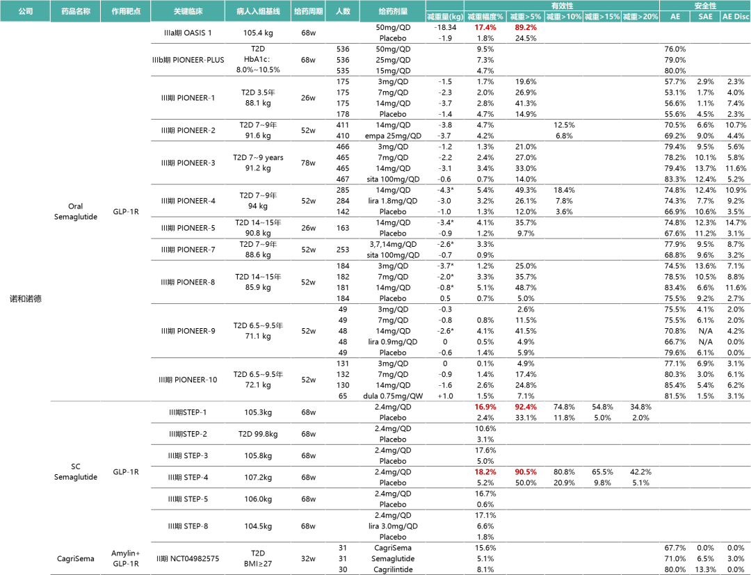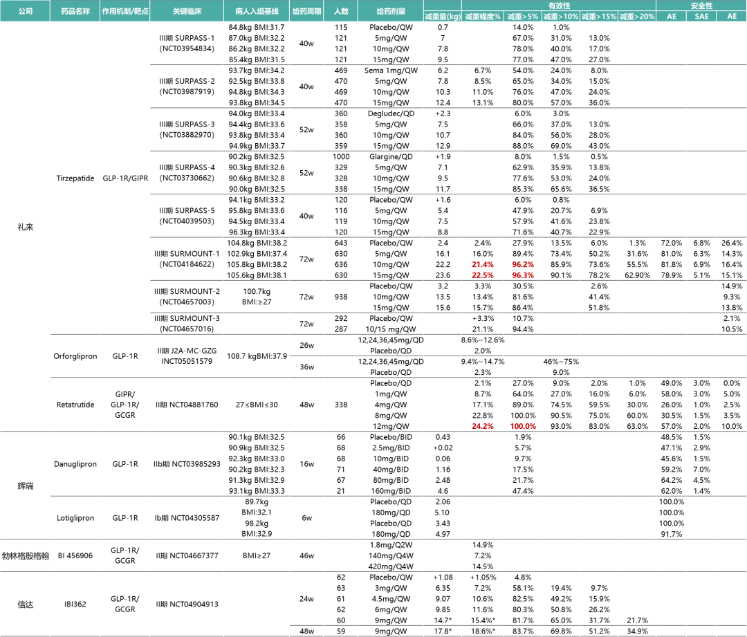 注:部分减肥药物关键临床研究数据对比(*数据为安慰剂调整后数据)
