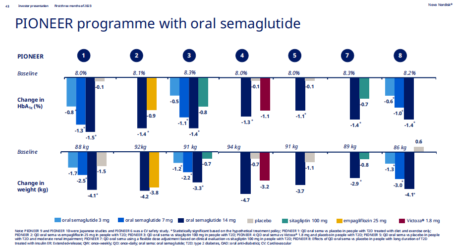对减肥人士来说,疗效会是制胜王道,每日一次的片剂在疗效更优的每周一次的注射剂面前也会缺少说服力。于是诺和诺德紧接着又开展了PIONEER-PLUS和OASIS系列研究,直接将司美格鲁肽片剂的最高剂量拉到了50mg。