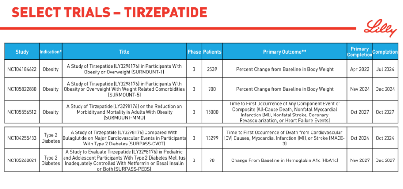 肥胖是导致心血管疾病的重要因素之一。但迄今为止,还没有一种经批准的减肥药物被证明能控制体重的同时降低心脏病发作、中风或心血管死亡风险。不言而喻,SELECT研究有着极其重要的里程碑意义,同时也为燃烧GLP-1千亿市场的火堆又添一把新柴。继司美格鲁肽后,礼来针对Tirzepatide布局的SURMOUNT-MMO和SURPASS-CVOT研究同样是瞄准了肥胖/糖尿病合并心血管风险这一巨大的患者群体。