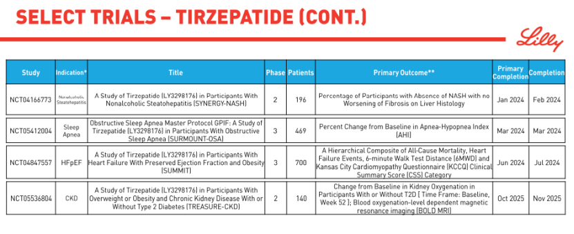 礼来也选择直面诺和诺德,启动了头对头比较Tirzepatide与司美格鲁肽减肥作用的III期SURMOUNT-5研究,预计2024年末完成。当然,礼来的布局远不止于此,Tirzepatide正在同步进行肥胖相关合并症的多项III期研究,包括SURMOUNT-MMO研究(减少肥胖合并症及死亡风险)、SURMOUNT-OSA研究(阻塞性睡眠呼吸暂停)、SURMOUNT-NASH研究(非酒精性脂肪性肝炎)、TREASURE-CKD研究(慢性肾病)、SUMMIT研究(射血分数保留的心衰)、SURPASS-CVOT研究(心血管风险)等。