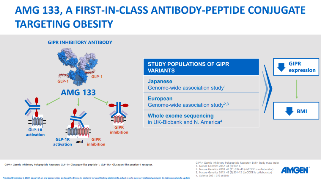 双靶点组合也备受各大玩家青睐。安进携AMG133来势汹汹,这款first-in-class双特异性抗体多肽偶联物同时抑制GIPR和激活GLP-1R。不难发现,安进在GIPR的作用方式选择上是与行业主流反其道而行的,以礼来为代表的一众药企则倾向激动GIPR。安进研发部执行副总裁David M. Reese揭秘,临床前和人类遗传学数据提示GIPR抑制可作为一种减肥机制,结合GLP-1R激动或能发挥协同作用。