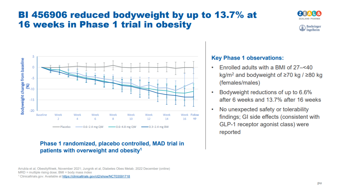 Survodutide在I期研究(NCT03591718)初露锋芒,治疗16周后,肥胖患者体重降幅最高可达13.7%。