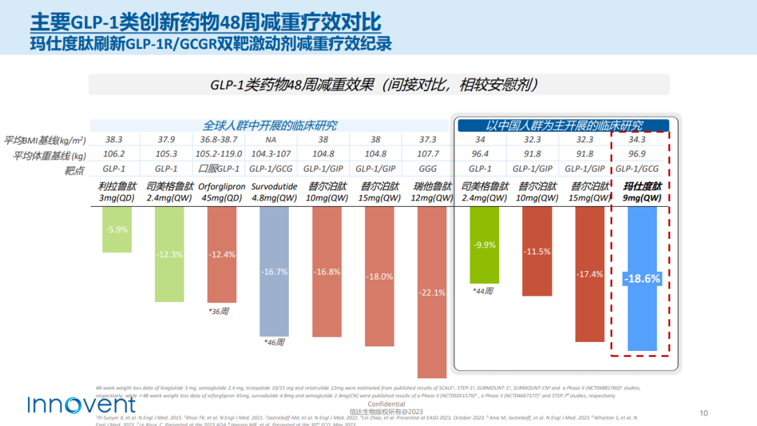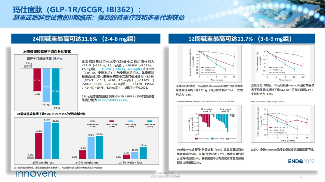 之后,信达在BMI指数更大的群体中开展24周的疗效探索。经安慰剂组校正后,9mg组体重下降14.7kg,降幅为15.4%。在达成24周主要终点后,信达乘胜追击,将研究治疗期延长至48周。最新数据显示,给药48周,9mg组患者体重较安慰剂组下降17.8kg,降幅为18.6%。