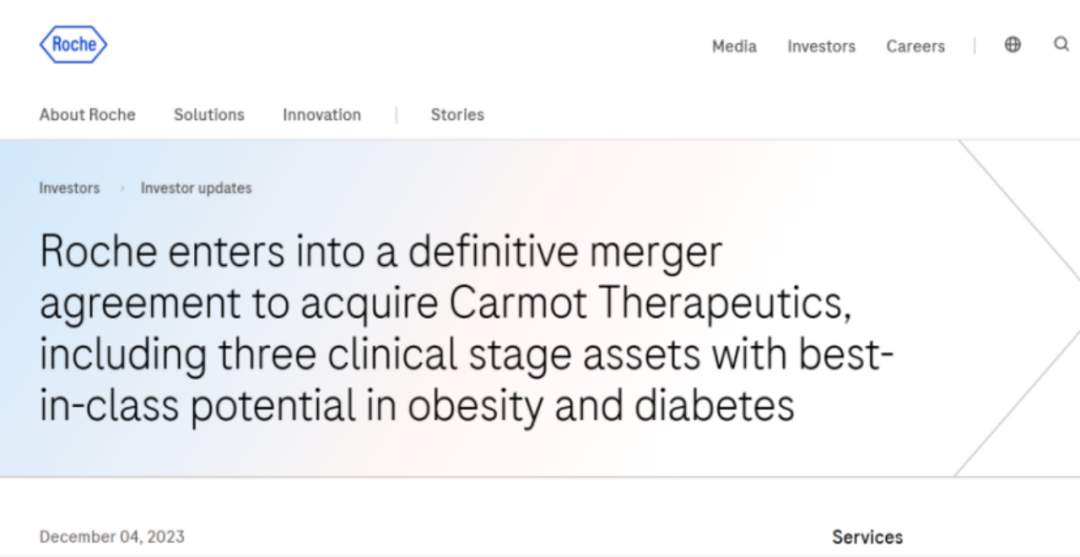12月4日,罗氏发布消息称,与聚焦代谢疾病临床开发的生物技术公司Carmot Therapeutics达成最终合并协议——罗氏将以27亿美元的预付款收购Carmot,后续还可能支付4亿美元的里程碑付款,Carmot及其员工将成为罗氏制药部门的一部分。此次消息一出,宣告罗氏入局GLP-1竞争,也再一次体现了今年的并购特点。