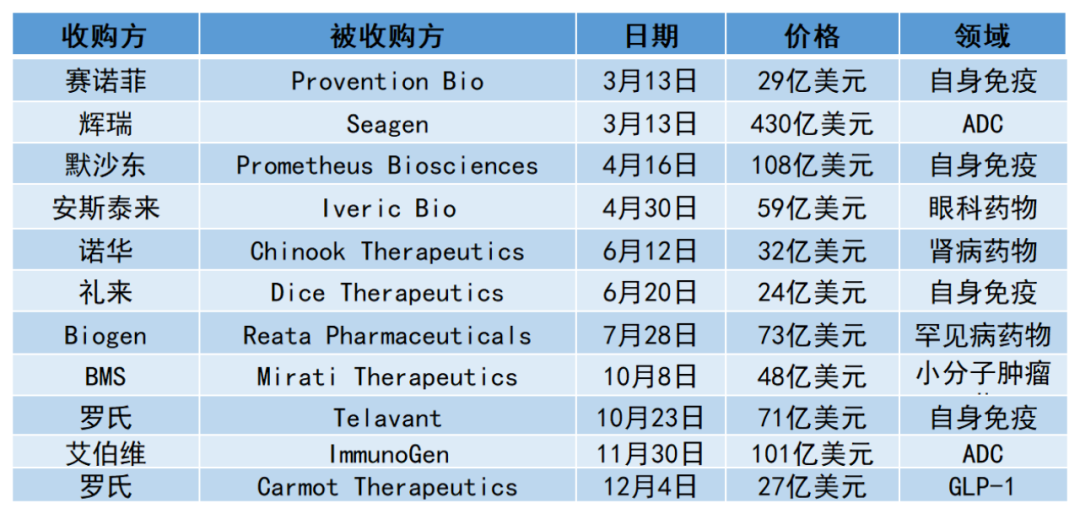 回头再看今年为数不多的并购,辉瑞以430亿美元收购Seagen,创下了2023年并购之最,也代表着当下抗癌新药研发对ADC技术的推崇;默沙东108亿美元收购Promtheus,瞄准自勉领域炎症性肠病药;诺华32亿美元收购 Chinook,聚焦肾病药物,加快自身管线的补充和扩建……几天前,艾伯维101亿美元收购曾ADC元老ImmunoGen,成为今年收购金额前三的大型并购交易之一。