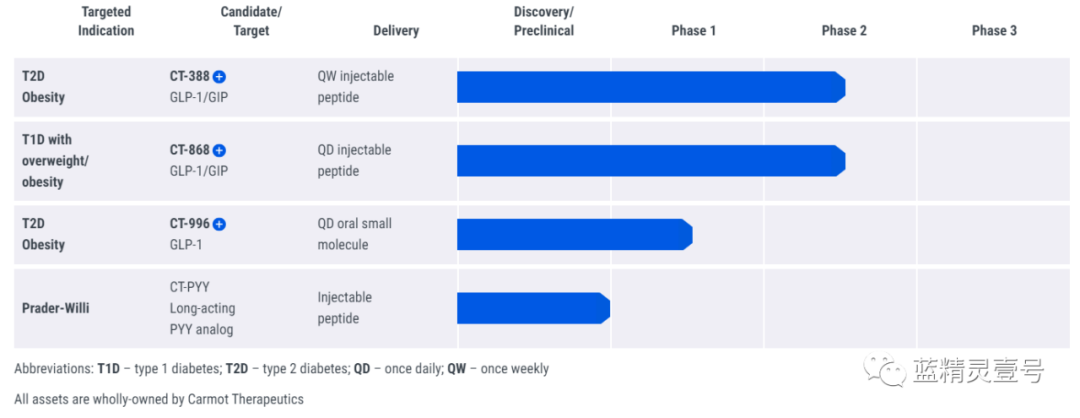 据悉,Carmot的临床产品管线主要包括三款口服和注射的GLP-1产品组合,用于治疗糖尿病和肥胖。其中,CT-388是其重要在研产品,为每周注射一次的GLP-1/GIP双重受体激动剂,用于治疗伴有或不伴有2型糖尿病的肥胖患者,目前处于II期,可作为单药和联合疗法用于减重,并扩展到其它适应症。