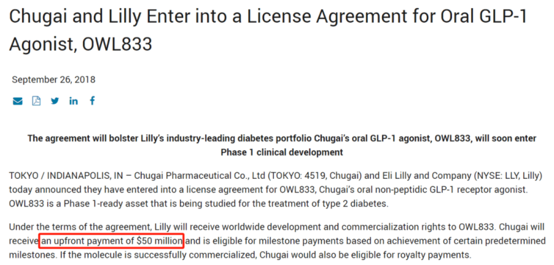 此前,罗氏旗下的中外制药(Chugai Pharmaceutical)曾经拥有口服GLP-1激动剂 OWL833,2018年9月26日中外制药宣布将OWL833授予礼来,首付款为5000万美元。这一产品,也就是现在的口服GLP-1在研产品orforglipron(LY3502970 )。