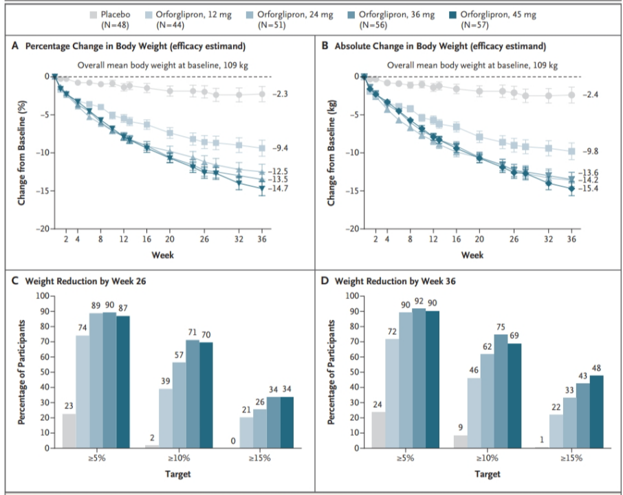 今年6月,礼来公布了orforglipron用于肥胖或超重患者的慢性体重管理的2期临床试验数据。结果显示,在第26周的主要终点评估中,orforglipron组在所有剂量下均显示出具有统计学意义的剂量依赖性体重减轻,减重范围为8.6%(9.0公斤)至12.6%(13.3公斤),安慰剂组为2.0%(2.1公斤);在36周时持续下降,减重范围为9.4%(9.8公斤)至14.7%(15.4公斤),而安慰剂组的体重减少了2.3%(2.4公斤)。
