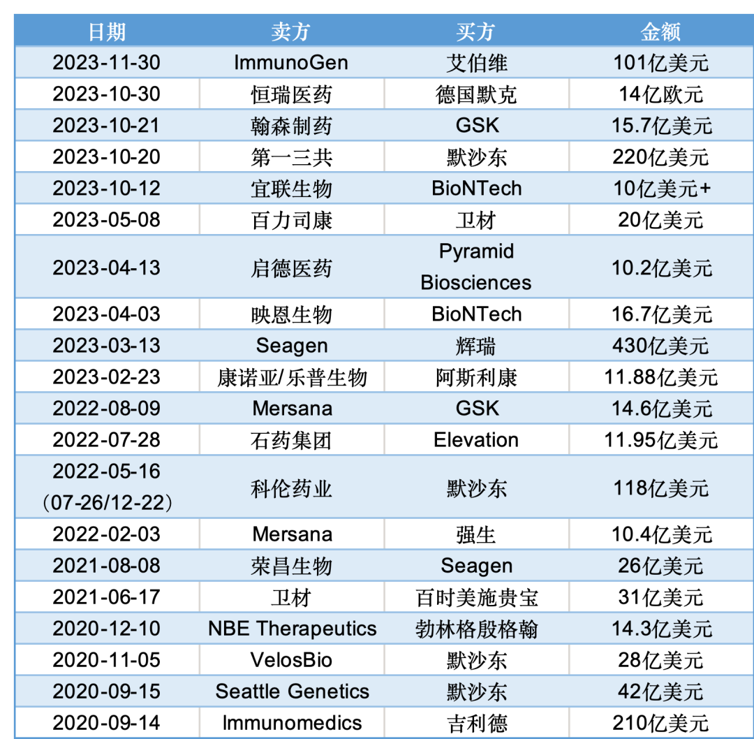 2023年头尾两大医药并购交易都与ADC有关。3月13日,辉瑞以430亿美元收购全球知名的ADC药物开发企业Seagen;11月30日,艾伯维宣布将收购ADC上市公司ImmunoGen,获得FRα ADC新药Elahere,以及在研产品CD123 ADC、ADAM9 ADC等。