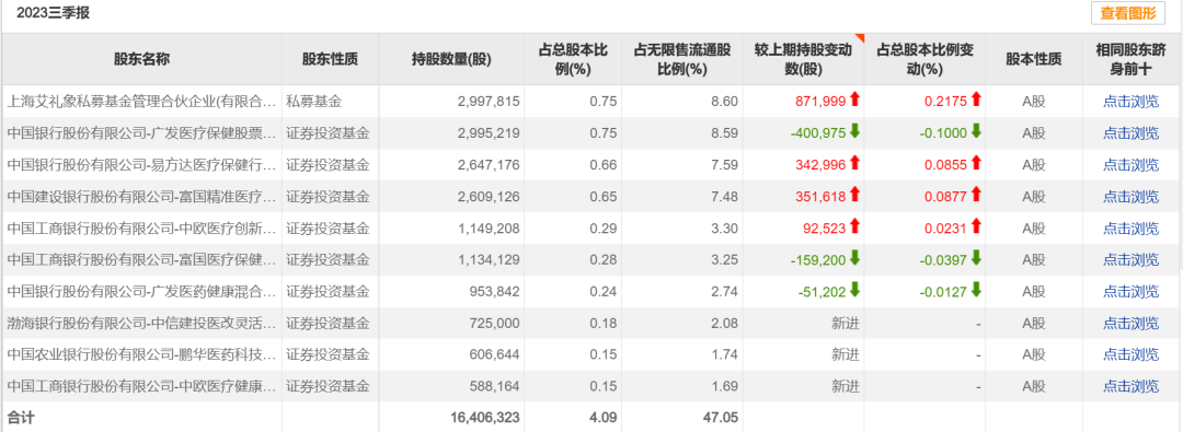 截至三季报,百利天恒的前十大流通股东有九个是公募基金,其中包括广发医疗保健、易方达医疗保健、富国精准医疗等。