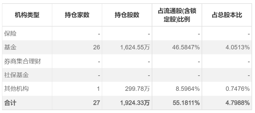 从股份占比来看,目前百利天恒流通股数量为3487.31万,公司三季报显示持仓公司股票基金数量为26家,持仓股数1624.55万(占流通股比例高达46.58%),加上其他机构的近8.6%,占流通股总数比例高达55.18%。