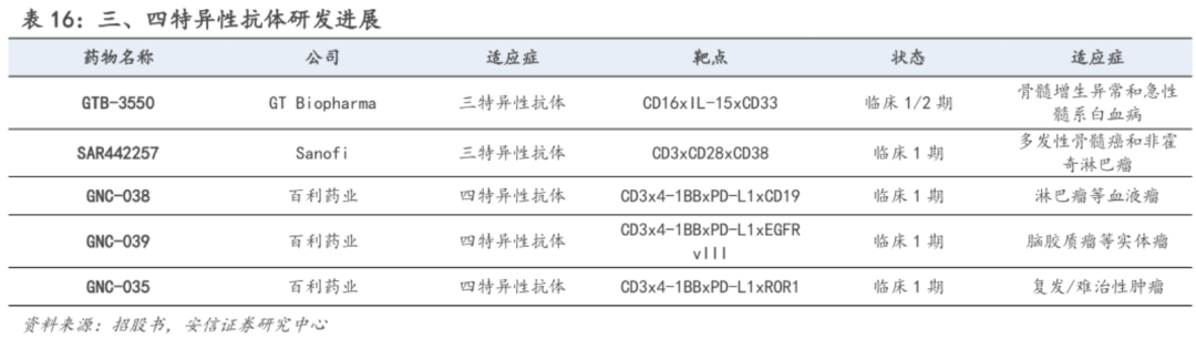 至于更进一步的三抗四抗,至今还未有产品获批上市,三抗有罗氏、赛诺菲MNC在积极布局。多抗要解决的问题并不少,不仅要解决抗体轻链和重链之间的错配问题,而且还要考虑CRS副作用、瘤内渗透性较差、脱靶效应等问题。