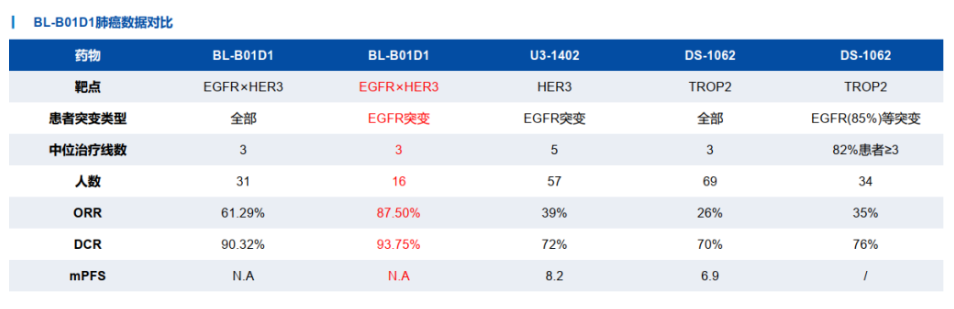 百利天恒BL-B01D1的临床早期数据确实非常惊艳,其在早先公布的1b期临床数据显示:31例三线NSCLC患者的ORR为61.29%,DCR为90.32%;在16例EGFR突变的NSCLC患者中,ORR高达87.5%,DCR高达93.75%。
