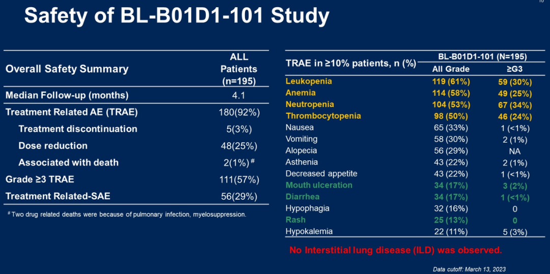 另外基于ADC药物特性,BL-B01D1的安全性也令人关注,在纳入的195名患者中,BL-B01D1大于等于3级治疗相关不良事件发生率为57%,因不良反应导致的停药率和药物减量率较低,分别为3%和25%,且未观察到间质性肺疾病。