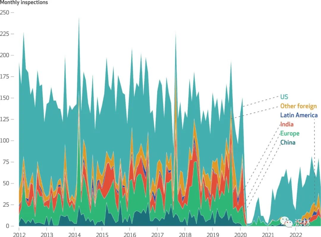 图1 2012-2022 年按世界地区划分的 FDA 月度药品质量保证检查数量