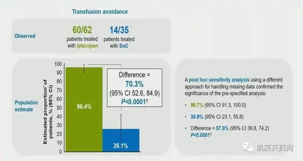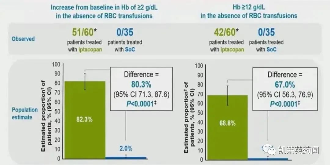 1、第24周,Iptacopan治疗组中无需RBCT的患者比例为60/62,而标准治疗组中的患者比例为14/35。