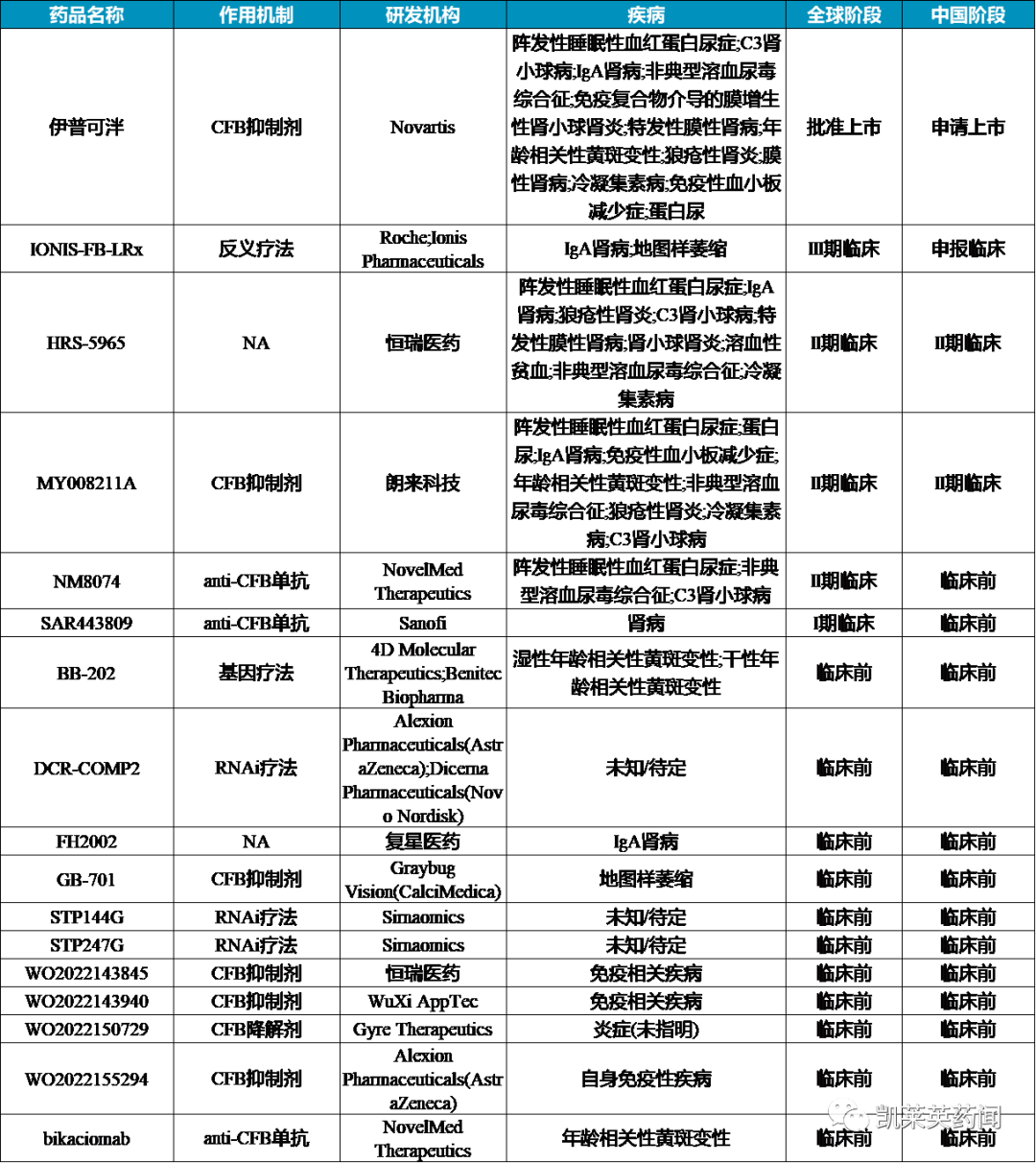 据不完全统计,目前针对补体因子B开发的在研药物约17余种,研究类型涵盖小分子抑制剂、单抗、反义疗法、RNAi等。