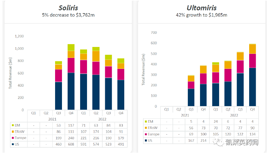 Soliris:是全球批准的首款补体C5抑制,除获批治疗PNH,还被批准用于治疗非典型aHUS,抗乙酰胆碱受体(AchR)抗体阳性的重症肌无力(MG)以及抗水通道蛋白-4(AQP4)抗体阳性且伴有复发病程的视神经脊髓炎谱系障碍(NMOSD),每周或每2周给药一次。2022年总收入高达37.62 亿美元。
