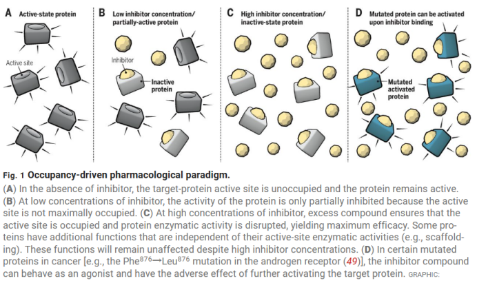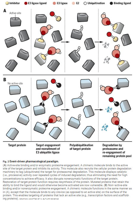 与传统的小分子和抗体等通过“占据驱动”的作用模式抑制靶蛋白的功能相比,PROTAC通过“事件驱动”介导致病靶蛋白降解。