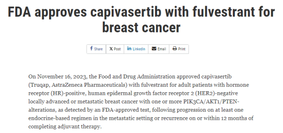 11月16日,美国FDA批准AKT抑制剂Capivasertib联合氟维司群(Faslodex)用于治疗HR阳性/HER2阴性且携带至少一种PIK3CA/AKT1/PTEN突变的局部晚期或转移性乳腺癌患者,患者需在至少接受过一种以芳香化酶抑制剂为基础的治疗后或在完成辅助治疗后的12个月内复发。